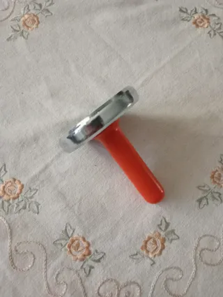 Batticarne con manico arancione e base in metallo. Alto. 11 cm, largo 8 cm. - Manico in plastica. - Base in metallo lucido.