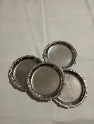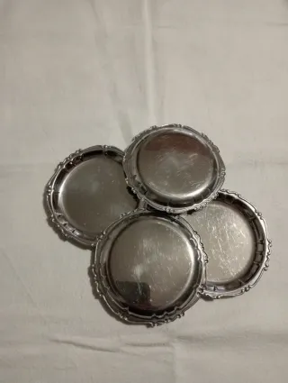 Set di quattro sottobicchieri vintage in acciaio. Circonferenza 9,5 cm. - Design elegante con bordo decorato. - Ideali per proteggere le superfici. - Aggiungono un tocco retrò alla tavola.