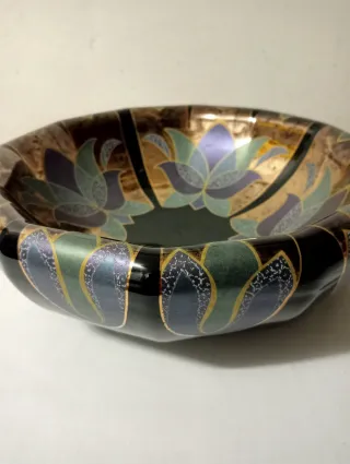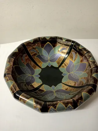 Elegante centro tavola vintage con un design floreale unico. Alto 11 cm, largo 30 cm. - Decorazioni con motivi floreali stilizzati. - Bordi sfaccettati con dettagli geometrici. - Finitura lucida che riflette la luce.