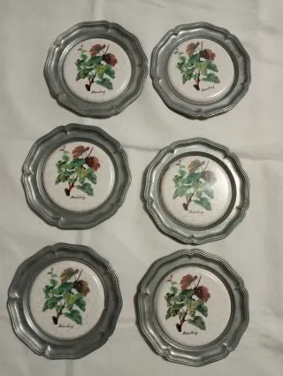 Set di sei quadretti decorativi vintage con cornice in metallo e inserto in ceramica raffigurante un ramo di uva. Circonferenza 10 cm. - Cornice decorata con motivo a onda. - Ceramica con disegno di uva e fogliame. - Ogni quadretto presenta la scritta Riesling.