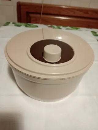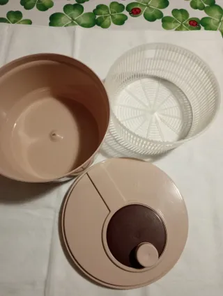 Centrifuga per verdure, utile per asciugare insalate e altre verdure. Alta 14 cm, larga 24 cm. - Design a due colori: beige e marrone. - Realizzata in materiale plastico resistente.