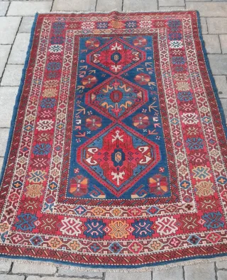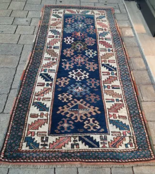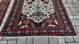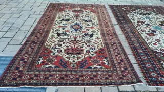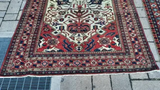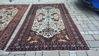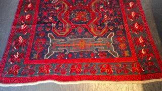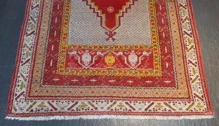 Bellissimo tappeto con un design intricato e colori vivaci. - Realizzato in lana resistente. - Motivi geometrici e floreali. - Bordi decorati.