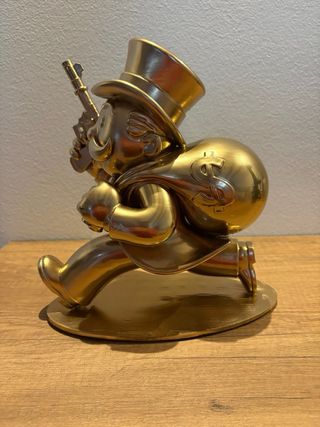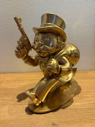 Action figure raffigurante mister Monopoli in una posa dinamica con in mano una pistola e un sacco di soldi. Statuetta alta 25 cm realizzata in resina sopra verniciata color oro. Ottimo pezzo da arredamento da collezione per gli amanti del celebre gioco da tavolo. Inoltre, sotto alla base l’oggetto è firmato Baraxprint