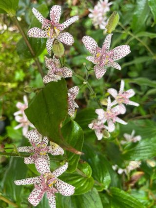 Pianta di Tricyrtis formosana Dark Beauty con fiori maculati. - Fiori bianchi con macchie rosa intenso. - Foglie verdi. - Ideale per giardini.