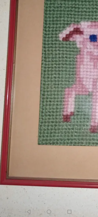 Delizioso quadretto realizzato a mano con la tecnica del punto croce, raffigurante una tenera pecorella. - Sfondo verde. - Dettagli in rosa e bordeaux. - Cornice inclusa.