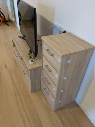 Mobile TV con cassettiera abbinata, ideale per il soggiorno. - Mobile TV con vani a giorno e cassetti 106x51x46h - Cassettiera a 4 cassetti 38x35x84h Piccolo graffio sul mobile TV come da foto