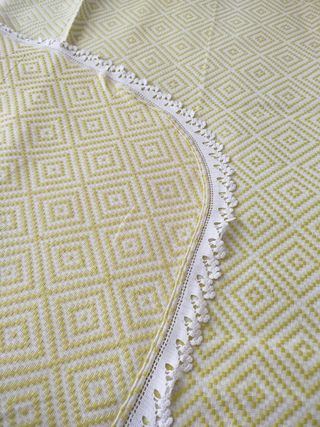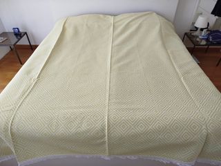 Copriletto matrimoniale anni ’70/’80 in ottime condizioni, realizzato a telaio con motivo geometrico a rombi nei toni del giallo e bianco. Materiale: cotone pesante. Non ci sono etichette visto che è un prodotto artigianale Dimensioni: circa 270 x 260 cm + frange decorative in pizzo di circa 4 cm lungo il bordo Lavorazione artigianale