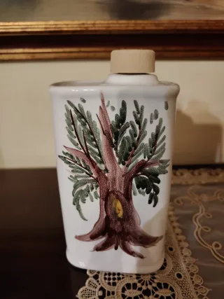 Elegante oliera in ceramica, perfetta per la tua cucina o tavola. Presenta una decorazione dipinta a mano. - Tappo in legno per una chiusura ermetica. - Design unico con albero dipinto.