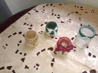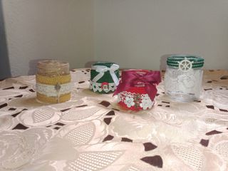 Bellissimi portacandele, perfetti per creare un'atmosfera magica durante le feste. Sono realizzati con vasetti di vetro decorati con pizzo, nastri Il prezzo s'intende a pezzo - - Decorazioni natalizie - Perfetti come segnaposto o centrotavola