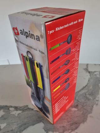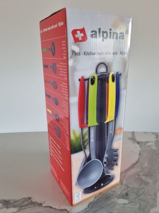 Nuovo e mai utilizzato, in confezione originale. Marca: Alpina 6 Utensili: mestolo zuppa, paletta scanalata, cucchiaio scanalato, cucchiaio da portata, cucchiaio da spaghetti, schiumarola Manici in gomma Soft Touch Giostra superiore rotante, fessura per appenderla, temperatura massima: 210°C Dimensioni: altezza 39 x Ø 13 cm. Questo set colorato di Alpina è l'aggiunta perfetta al piano di lavoro della cucina. Gli utensili sono realizzati in nylon antiaderente resistente al calore per un uso versatile e comodo.