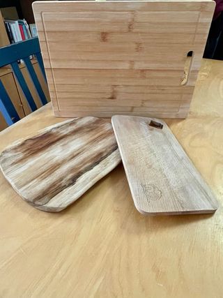 Set di tre taglieri dal design rustico. - Realizzati in legno e bambù. - Diverse tonalità di beige e marrone.