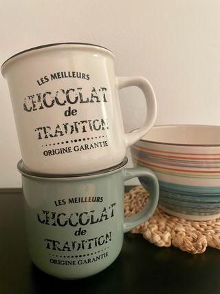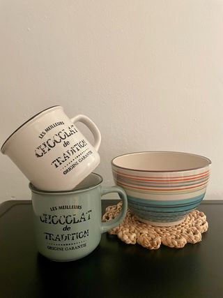 Set di tre tazze in ceramica con un design vintage. - Tazza bianca con scritte nere. - Tazza verde acqua con scritte nere. - Tazza rotonda dipinta a mano. - Ideali per bevande calde.