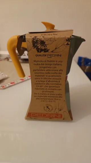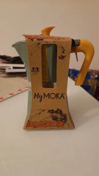 Caffettiera moka Pedrini per 6 tazze, ideale per preparare un ottimo caffè. - Design moderno con finiture verdeazzurro e gialle. - Realizzata in metallo e plastica.