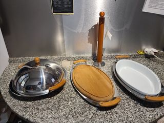 servizio da cucina e tavola, 5 pezzi, anni '80-'90 tutti acciaio inox 18/10 ,legno e porcellana, con stato d'uso come specificato singolarmente: 1) pirofila rotonda porcellana da forno, diametro 28, con tegame diametro esterno 36 con manici e coperchio a campana, alcuni segni nella parte interna del vassoio inferiore. 2) Pirofila ovale ceramica da forno con vassoio con manici, 40x26, con cartellino 3) Tegame ovale, basso, 40x26 con coperchio tagliere in legno, con cartellino 4) Tegame rettangolare basso, 45x28 con coperchio tagliere in legno, con cartellino 5) Portarotolo acciaio e legno h 43, con cartellino