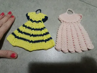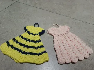 Set di presine fatte a mano all'uncinetto, a forma di graziosi vestitini. - Una presina è gialla con strisce blu scuro. - L'altra presina è rosa pallido con un motivo traforato. Buonissime condizioni
