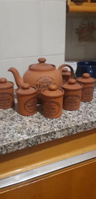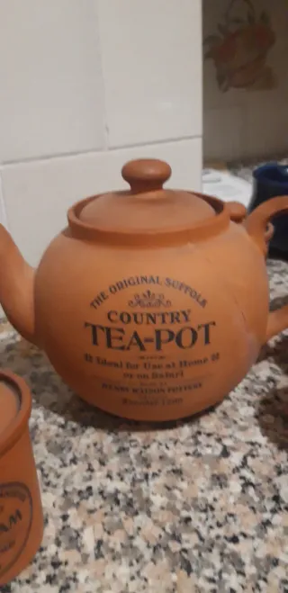 Set composto da una teiera e 6 barattolini in terracotta, perfetti per la tua cucina. - Teiera The Original Suffolk Country Tea-Pot. - 6 barattolini abbinati. - Design rustico e tradizionale.