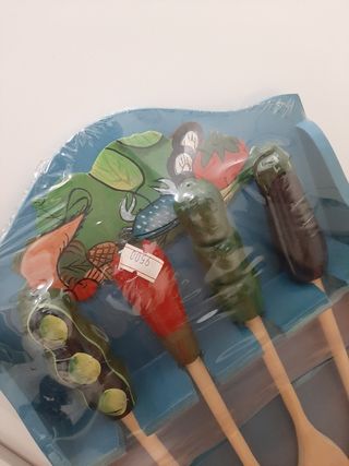 Coloratissimo set di sei accessori sempre utili in cucina con manico in legno e su supporto anch'esso in legno. Mai adoperato, presenta qualche segno di ruggine sull'anello di raccordo col manico, come evidente nell' ultima foto. Per il resto è in ottime condizioni