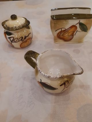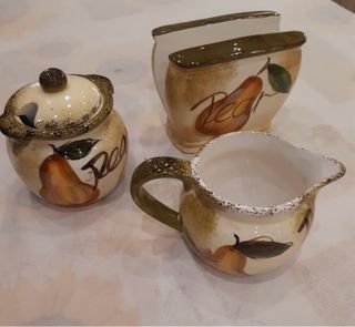 Bellissimo set da cucina in ceramica con decoro a pere. Il set include un zuccheriera con coperchio, una cremiera e un porta tovaglioli. I pezzi sono nuovi e presentano un aspetto elegante e rustico. - Zuccheriera con coperchio - Cremiera - Porta tovaglioli