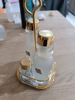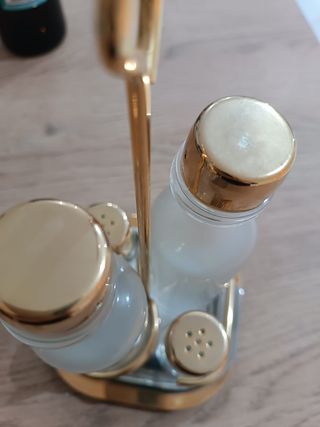 Set olio ,sale,pepe e aceto della Inoxpran con finiture in oro zecchino 24 kt come da garanzia Contenitori in vetro trasparente.i tappi dei contenitori per olio e aceto non si chiudono bene bisogna forzare