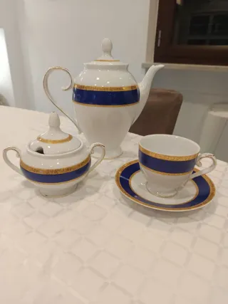 Elegante e raffinato servizio da tè in autentica porcellana Limoges, composto da 29 pezzi. Un set raffinato , nuovo ed esclusivo con elementi di pregio, ideali per occasioni speciali. - Design con dettagli blu e oro. - Include teiera, zuccheriera, lattiera, 12 tazze + 12 piattini. Il suo valore di mercato è molto più alto del prezzo di vendita Nuovo con confezione