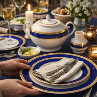 Elegante servizio da tavola da 41 pezzi, un vero tocco di classe per la tua casa. - Design raffinato con dettagli blu e oro. - Realizzato in pregiata porcellanadi Limoges È un set completo per 12 persone così composto 12 piatti piani 27 cm 12 piatti fondi 25 cm 12 piatti frutta 22 cm 3 piatti da portata 1 zuppiera con coperchio 34 cm 1 insalatiera 25 cm. Il set è autentico ed esclusivo con elementi di grande pregio ed è nuovo con confezione È disponibile anche servizio da the e da caffè