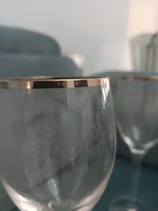 Elegante servizio composto da brocca e dodici coppe in cristallo con finiture in platino. - Brocca con manico e beccuccio. - Dodici coppe con ricami a rilievo - Dettagli in platino sul bordo. Nuove con confezione Disponibilità di flute e bicchieri acqua in abbinamento