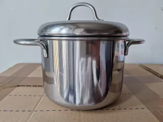 Pentola in acciaio inox, utilizzata ma in buone condizioni. Coperchio incluso. Diametro 16 cm Altezza 12 cm