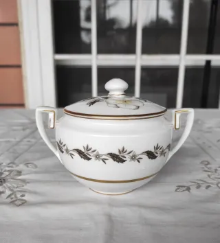 Elegante zuccheriera in porcellana finissima inglese Bone China di Royal Worcester, serie Bernina La porcellana è bianchissima e perfetta, decoro in color freddi invernali, condizioni pari a nuovo da negozio. Larga da manico a manico cm15 e alta 11 Se guardate l'ultima foto, starebbe benissimo con un servizio da caffe x6 sempre Royal Worcester che ho in vendita, nel caso chiedete