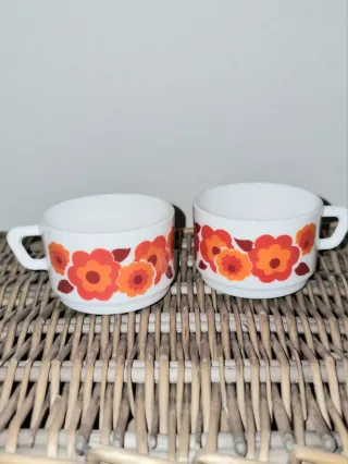 Set di due tazzine da caffè anni '70 in vetro opale temperato con un vivace motivo floreale. Lavabili in microonde e lavastoviglie - Design iconico Arcopal Lotus. - Decorazione floreale arancione e rossa. - Ideali per un tocco vintage alla tua tavola. #arcopal#arcopallotus#tazzinecaffe#arcopalfrance#lotus#tazzinevintage#anni70#home#maison#modernariato