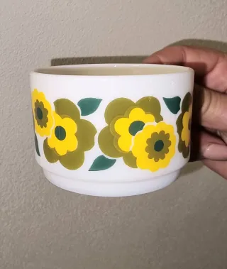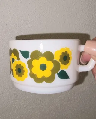 Tazzina da caffè Arcopal Lotus in vetro opale temperato con un vivace motivo floreale. Lavabile in lavastoviglie e adatta per microonde - Design anni '70. - Decorazione con fiori gialli e dettagli verdi. - Misure in foto #arcopalfrance#tazzinevintage#anni70#modernariato#arcopallotus#retro#home#maison#tazzinecaffevintage
