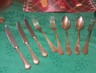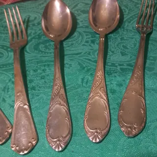 Elegante set di posate vintage con placcatura in argento 800. - Set composto da 3 coltelli, 2 forchette e 2 cucchiai.di differenti stili - Design classico con dettagli decorativi sul manico. - Ideali per occasioni speciali o per arricchire la tavola di tutti i giorni.