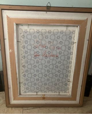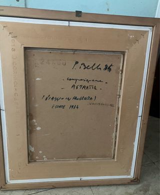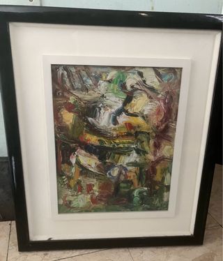 L'immagine mostra un'opera d'arte astratta incorniciata, realizzata su masonite e riconducibile al genere dell'arte popolare. Tecnica e Stile: L'opera presenta pennellate dense e visibili, tipiche di uno stile espressionista o astratto, con un uso vibrante del colore. Materiale: Il supporto dell'opera è la masonite, un materiale comunemente utilizzato nell'arte popolare, specialmente per insegne o dipinti con un'estetica più rustica. Contesto: Simili opere d'arte popolare in masonite, come insegne commerciali o dipinti decorativi, sono state prodotte in vari periodi, inclusi gli anni '50, come suggerito da esempi di arte popolare