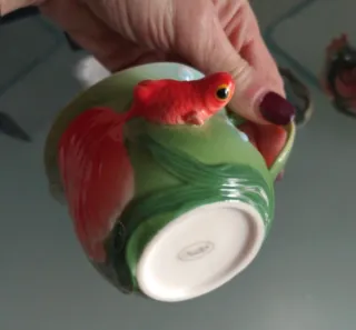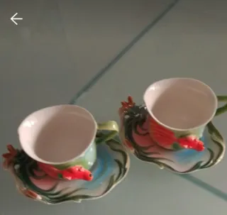 Elegante set di due tazze con piattini, in stile Franz Collection. Perfette per aggiungere un tocco artistico alla tua tavola. - Design unico con decorazioni a forma di pesce rosso. - Realizzate in ceramica e porcellana di alta qualità. - Colori vivaci e dettagli curati.