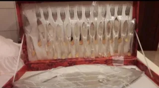 Elegante set di posate da pesce, completo di sperlunga. Ideale per occasioni speciali. - Finitura bicolore oro e argento. - Realizzato in metallo di qualità.