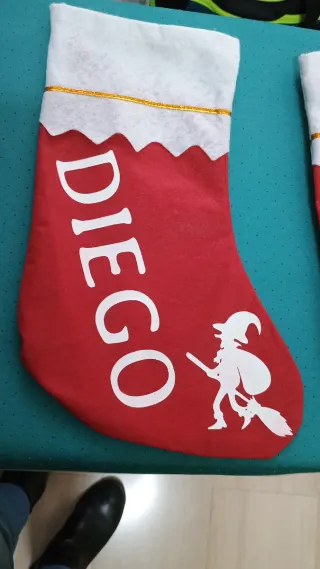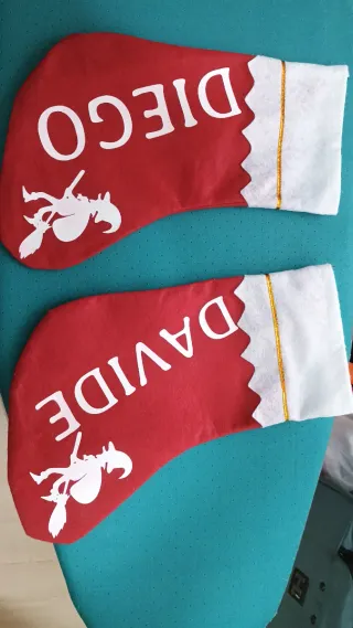 Due calze della Befana rosse, personalizzate con nomi bianchi e un disegno della Befana. - Nomi personalizzabili - Finitura bianca con bordo dorato. Misure come da foto