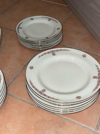 Elegante servizio di piatti per sei persone, con un delicato motivo floreale. - Design classico con bordo decorato. - Ideale per occasioni speciali o uso quotidiano. 6 piatti piani 6 piatti fondi 5 piatti da dolce Un piatto grande Una pirofila grande Una coppa grande