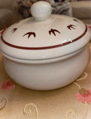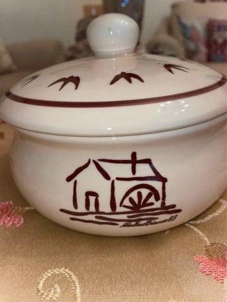 Zuccheriera in ceramica con decorazioni a tema. - Raffigurazione di un mulino. - Decorazioni con uccellini sul coperchio. - Firma dell'artista e anno '83 sul fondo.