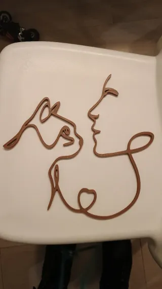 Delicata decorazione da parete in stile line art, raffigurante un gatto e una figura umana che si fronteggiano. - Design moderno e minimalista. - Realizzata in pla con stampante 3d - Colore marrone caldo.
