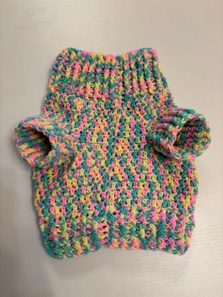 Maglioncino a collo alto per cani, realizzato interamente a mano all’uncinetto 🧶 In bellissimo color mélange Marshmallow rosa, giallo e verde 🍭 in lana acrilica morbida e calda 🧸 Realizzato in maglia elastica, quindi adattabile a diverse taglie 📏 Misura (a riposo): circonferenza collo 38 cm Circonferenza torace (subito sotto le zampe) 48 cm Lunghezza del collo 8 cm Lunghezza da sotto il collo fin giù 23 cm Lunghezza totale 31 cm