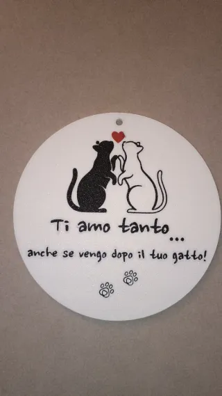 Deliziosa decorazione da appendere con una dolce frase per gli amanti dei gatti. - Raffigura due gatti stilizzati che si guardano con un cuore. - Scritta Ti amo tanto... anche se vengo dopo il tuo gatto! - Impreziosita da impronte di zampa. -ideale per le coppie.... Che amano di più il loro gatto! -14 cm diametro