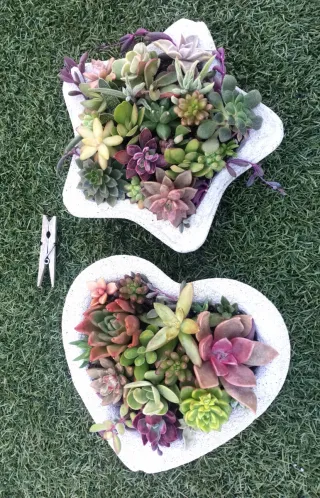 Due vasi artigianali con piante grasse. Entrambi contengono più di una dozzina, per un totale di quasi 20 diverse specie. Le due unità a 25 euro.