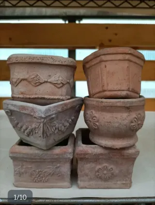 Set di 6 mini vasi in terracotta, perfetti per piccole piante o decorazioni. - Design classico toscano. - Finitura rustica. - Con decorazioni floreali o grappolo d'uva. - Ideali per uso interno o esterno. Misure - ottagonale h5x8cm - rotondo h7x8cm - ovale h6x8x6cm - rettangolare h6x8x6cm - quadrato h6x8cm Prezzo fisso e già scontato per 1 vaso €5