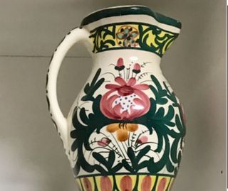 Bellissimi vasi in ceramica con un design floreale dipinto a mano. Ideali per aggiungere un tocco di colore alla tua casa. Due vasi: Vaso blu alto 22,5 cm (piccole crepe, visibili solo da un lato). Vaso toni rossi alto 23 cm Motivi floreali in toni di verde, rosa e giallo. Manico decorato con un motivo a righe. Base con strisce verticali.