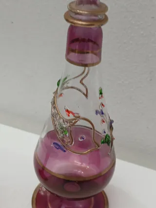 Elegante coppia di vasi in vetro soffiato, perfetti come elementi decorativi. - Design a forma di boccetta. - Decorazioni floreali e dorate. - Tonalità viola intenso e trasparente.