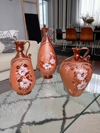 Questo set include tre vasi decorativi con un design unico. Finitura in tonalità terrose e dorate. Realizzati in ceramica e terracotta. Dettaglio di fiori dipinti. Si trovano in ottime condizioni, solo uno ha un piccolo segno, quasi impercettibile (foto 5).