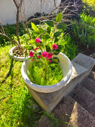Set di quattro vasi in pietra con un design elegante. Colore beige e grigio. Materiale in pietra resistente. Ognuno costa 13 euro. Se acquisti tutti e 4, te li vendo a 49€. Ritiro a Puertollano.