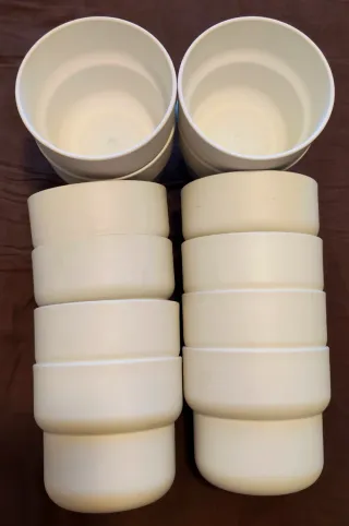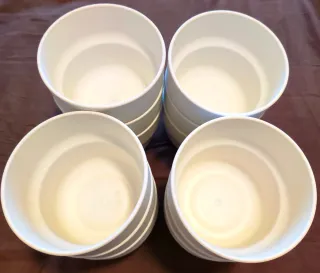 Set di 14 vasi decorativi dal design moderno. - Colore bianco. - Materiale in plastica. - Impilabili per un facile stoccaggio. - Ideali per nascondere i brutti vasi da giardinaggio in cui di solito si trovano le piante. - Dimensioni: 130 mm di larghezza in alto x 120 mm di altezza. Preferisco consegna a mano a Barcellona, ma è possibile spedire.