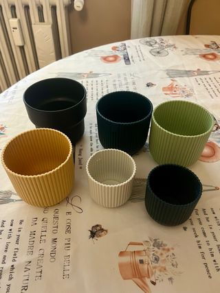 Vendo 6 piccoli porta vasi, in condizioni ottime, in plastica: - uno nero, marca Ikea, circonferenza 9 cm; - uno giallo, uno verde acqua e uno blu scuro, marca Elho, circonferenza 9 cm; - uno bianco e uno blu scuro, marca Elho, circonferenza 7 cm. Vendibili anche divisi, se necessario. Contattatemi se interessati, sconti previsti per set di 2 o più articoli!
