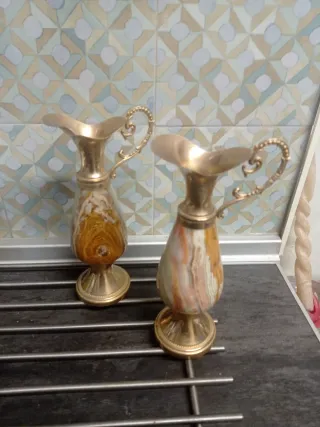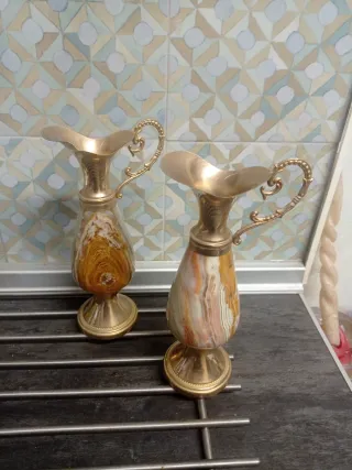 Set di due vasi decorativi con base e maniglia in metallo dorato e corpo in pietra onice. Ogni pezzo presenta un design unico con venature multicolori. Med. 23 cm. - Base e maniglia in metallo dorato. - Corpo in pietra onice con venature naturali. - Design antico. Spedisco.