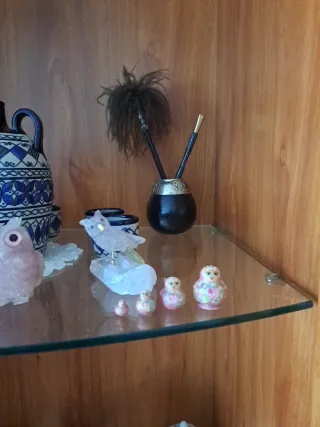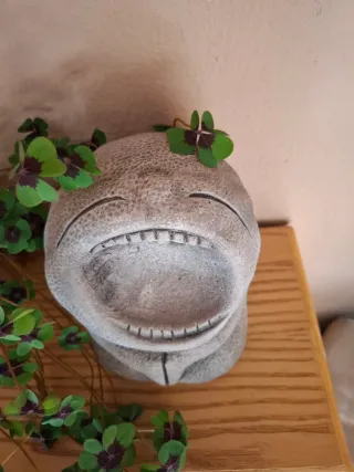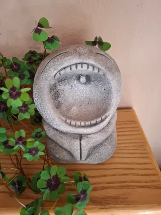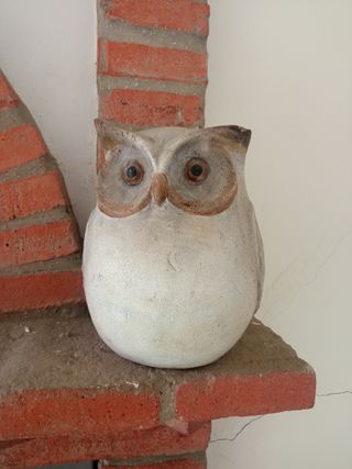 Vendo statuetta decorativa di un gufo con un design unico. Corpo principale in pietra beige. Dettaglio di incastonatura di cristallo multicolore sulle ali. Misura 18 cm di altezza x 14 cm di profondità, corpo circolare. Aspetto artigianale e originale. Ideale per qualsiasi angolo in veranda, giardino, balcone, pergole, ecc.
